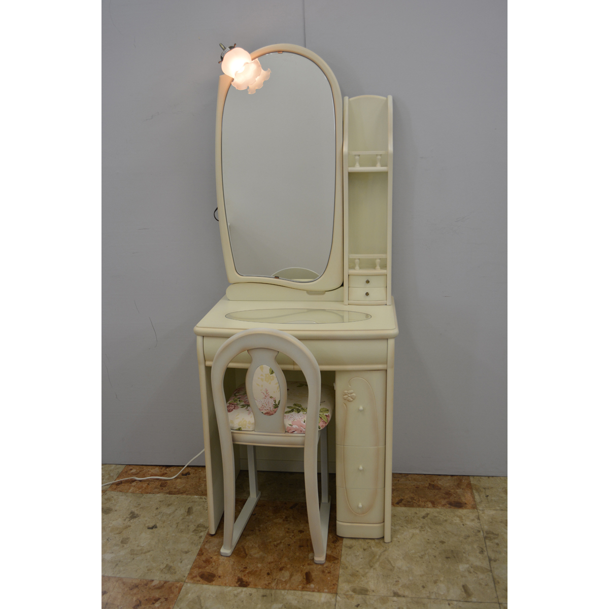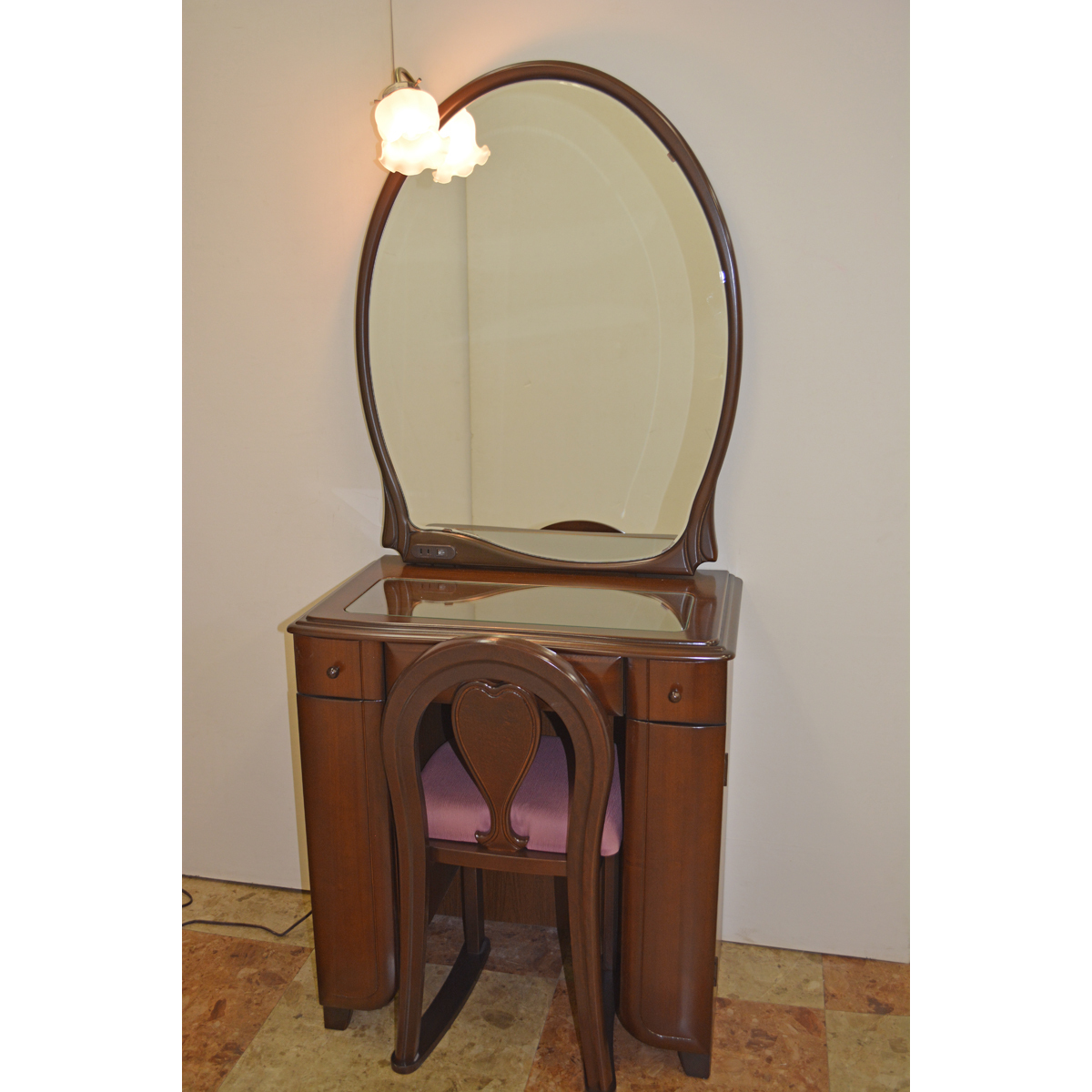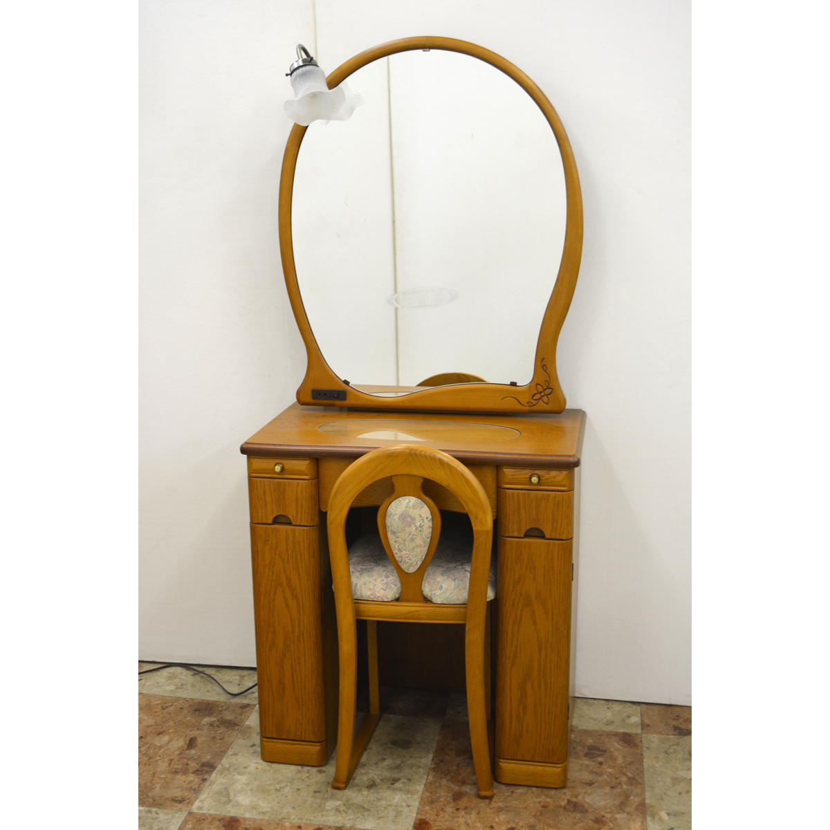 チェストも台の中に納まり、コンパクトになります。小判型で優しい雰囲気のアンティークドレッサーです。