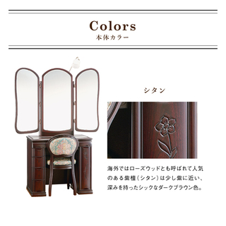 全体にボリュームがあり、上品な三面鏡(収納タイプ)です。右扉にはお花の彫刻を施しており可愛らしい表情です。七分三面鏡(半三面鏡よりも両袖の鏡の幅が広く)お顔も映し易いです。
