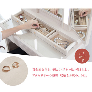 真ん中中央部分に柔らかく優しいLEDライトが2本付いており、お顔を優しく照らしてくれる三面鏡です。全体の雰囲気がメルヘンティックです。鏡の裏の収納部分や大容量に収納できる椅子が特徴です。お揃いの幅800のプリティカチェストも好評です。お色目はメルヘンティックなミルキーホワイト色とアンティーク色がございます。