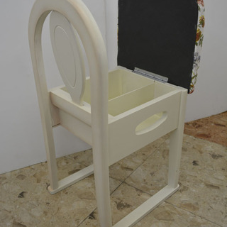 デスクとしても使えます。正面の引出しは深さ9センチあり、中に宝石箱付きです。右袖下は3杯の引出しに分かれており、最上部の引出しには高さのあるお化粧ビン等の収納が出来ます。椅子はティッシュBOXが収納出来て便利です。