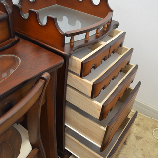 | 三面鏡サイズ:幅600mm×奥行450mm×台までの高さ745mm(総高さ1650mm) チェストサイズ:幅450mm×奥行450mm×高さ850mm | |