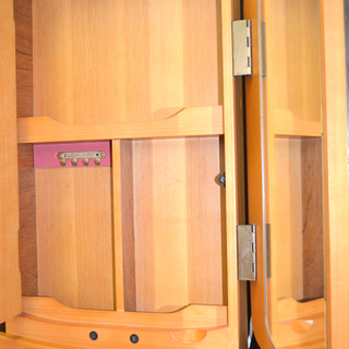 全体に優しい丸みのある可愛らしい収納タイプの三面鏡です。天板は手前にスライドし、奥に小物、、時計、アクセサリーなどの収納ができます。台の左側の収納部分にもネックレス掛けがございます。
