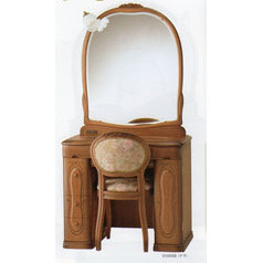 どっしりとしたバランスの取れたデザインです。前面は無垢材ならではの、丸みとボリュームのある彫刻が、高級感を増します。左袖にはたっぷり収納出来る高級桐材の3段引出し