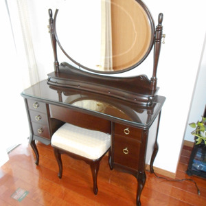 | 鏡の両側にある金具で、角度が調節できますので、より広い視界を映し出すことができます。鏡の前に立った際、見える範囲が、広がりますので、ファッションのコーディネートの確認などにも、お使いいただけます。 | 引き出しの取手は、重厚感のある真鍮製です。また、サイドに彫りの装飾を施しました。 |