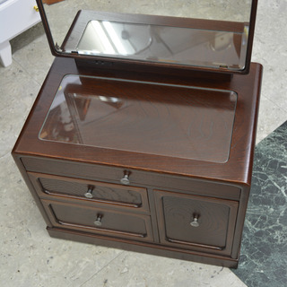 古人が魅せられた総天然けやきの美しい木目の座鏡です。悠久の時が育てた匠の技を心ゆくまで味わえる鏡台です。鏡は広面取りで豪華です。引出しは総桐ベタ底仕様です。塗装は伝統的なうるし塗りを、現代的にアレンジした、うるし調の民芸」色仕上げで趣があります。又、金具引手はけやき杢に合う「真鍮のウス古美荒シ銀メッキ」を施しております。