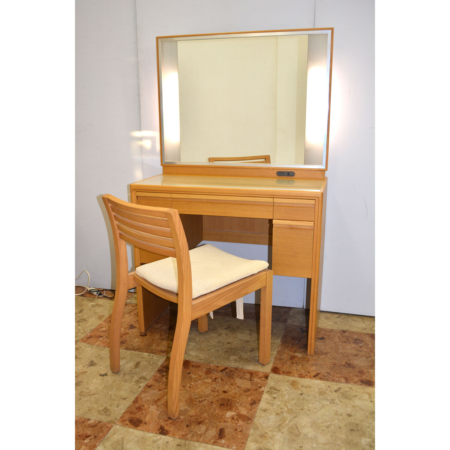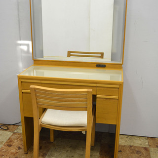 ナラの無垢の材料の仕様で、高級かつモダンな雰囲気のドレッサーです。座面の広い椅子も無垢のナラ材仕様でゆっくりお座りいただけます。