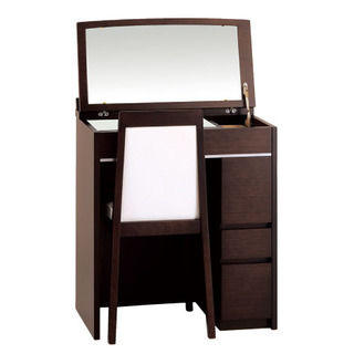 幅650mmのシンプルモダンな回転鏡です。高級な質感とモダンデザインで人気です。鏡を開けると親切にガラス天板が登場し、お化粧の他にデスクとしてもご利用できる優れものの回転鏡です。1段目の引出し内部はおしゃれなラシャ張りで仕分け付きで便利です。すっきりした椅子も素敵です。
