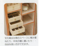 鏡のウラ収納には小物、バックなどの収納ができ、ネックレス掛、ベルト掛、スカーフ掛など、いろんな機能が付いております。中はベージュのモケットが全体に張ってあります。 | 宝石箱は左側のスペースに積み重ねたり、中央の棚に置いたり、自由な使い方ができます。 |