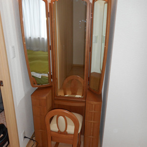 ドレッサーの中で数少ない姿見タイプの三面鏡(収納タイプ)です。両サイドの鏡の袖幅が広く、横顔も見え易いです。天板(中テーブル)が前後にスライドし、メイク時は引出して化粧台としてお使い頂けます。姿を見る時は収納すると、全身が映せます。また真ん中の鏡の裏が収納スペースとなっており、充分な収納スペースを確保できます。