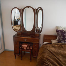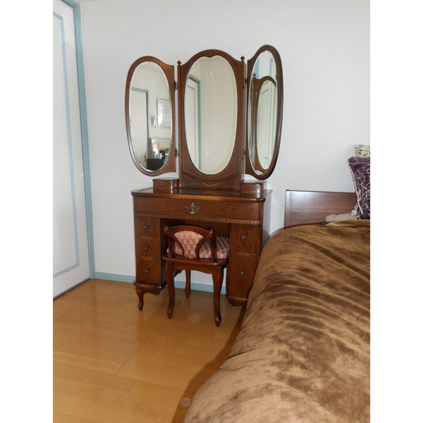 12月14日に福岡在住のお客様のBEDルーム(寝室)に、当店人気No1の三面鏡フランソワ アンティーク色を設置させていただきました。BEDフレームのお色にもマッチし落ち着いてなごやかな雰囲気でした。猫脚のヨーロピアンクラシカルデザインの三面鏡です。椅子はピンク色にされお部屋全体も可愛らしい雰囲気になりました。