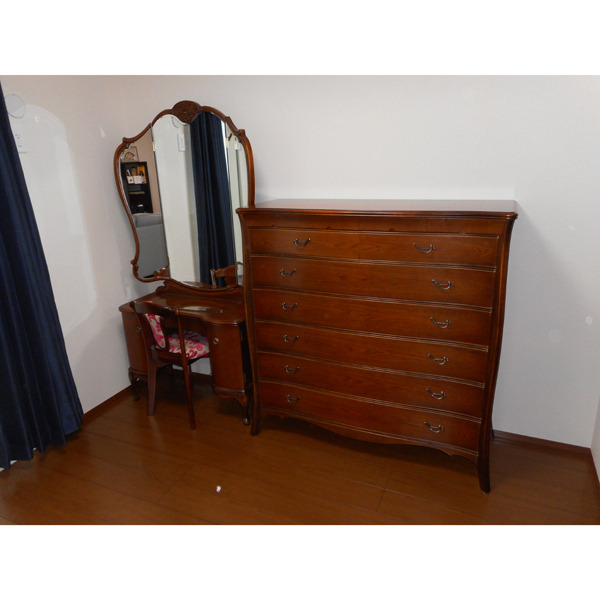 H28年4月にお嫁入り先に納品の後、5月に新居へ三面鏡エスメラルダ(アンティーク色)とビッグチェスト(アンティーク色)を移動させて頂きました。