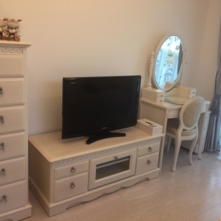 「とても素敵なドレッサーです。 お部屋にピッタリです(╹◡╹)」とお客様のお喜びの声をいただきました。ご新築の素敵なお部屋の一角にホワイトアンテイーク色のドレッサーがお似合いです。