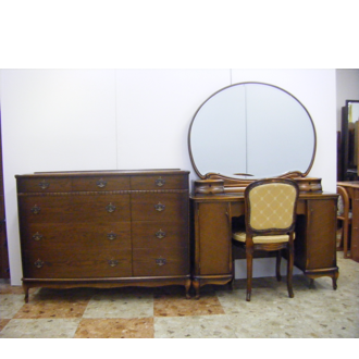 お母様から、娘さんへの婚礼家具として新居に入れたいとの問合せがあり、三面鏡と一面鏡の違いや椅子の柄を丁寧に説明しました。鏡台の他の色も比べたいとのことでホワイト以外のアンティーク色を撮影し、HPへ新規でアップさせていただきました。