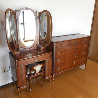 見た目にも癒される使い勝手の良い収納三面鏡と幅1200mmあるアンティークデザインのチェストです。