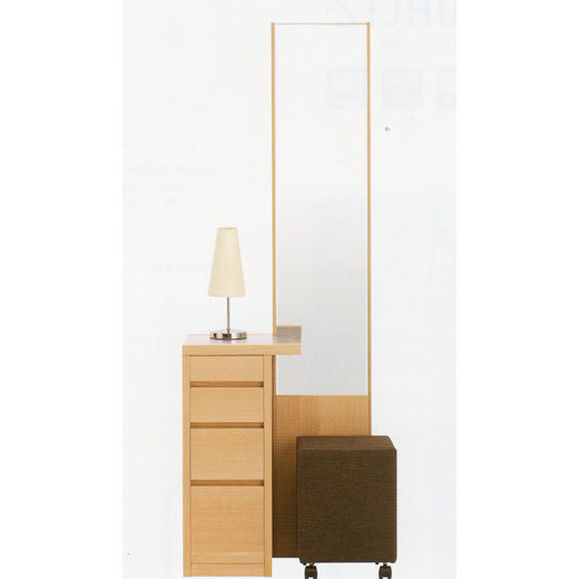 左右の袖が入れ替えられ、スタンドランプ付きでキャスター付き椅子も便利なシンプルデザインです。すっきりした鏡のフレームと液体こぼれに強いアルミ天板が特徴です。幅も600mmとコンパクトです。
