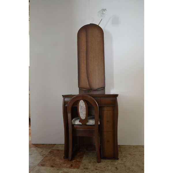 デスクとしても使えます。正面の引出しは深さ9センチあり、中に宝石箱付きです。右袖下は3杯の引出しに分かれており、最上部の引出しには高さのあるお化粧ビン等の収納が出来ます。椅子はティッシュBOXが収納出来て便利です。