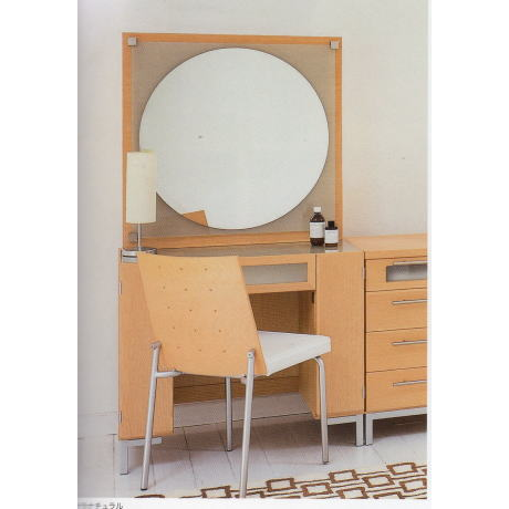 今迄にないスモークガラスをバックに、浮きだし取り付けミラー仕様になっております。シンプルの中にゴージャスさをミックスしています。鏡枠の四隅には上品なアルミを取り付けております。天板にもスモークガラスを使用し、中がかすかに見えるのが魅力的です。又脚にもアルミを使いおしゃれです。